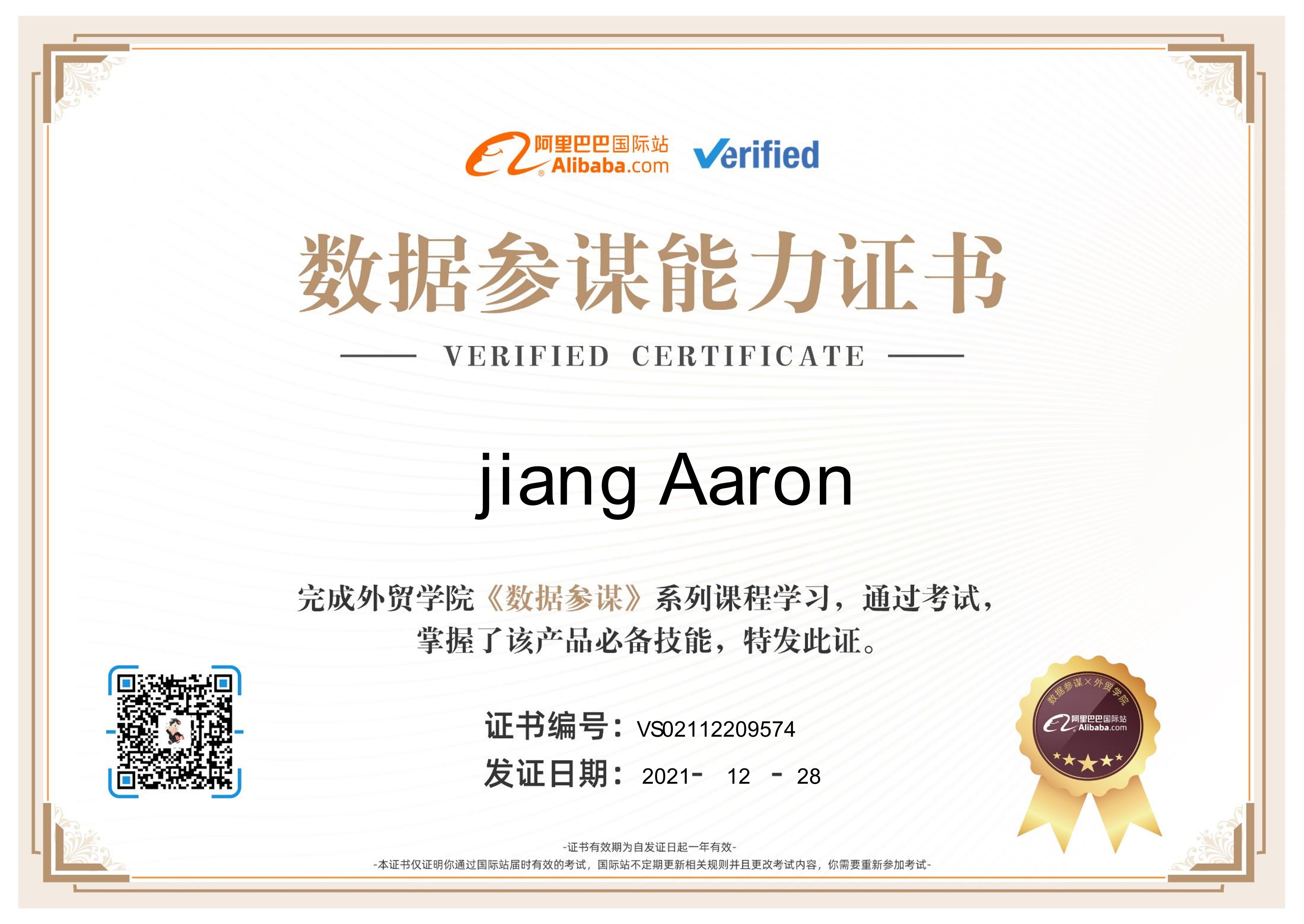 东莞市大江电子于2021.12.8日荣获阿里国际站《金品权益操盘官》,《数据参谋能力证书》;我司得到了阿里国际站的认可,也意味着我司的实力也有所提升,也得到了认可。